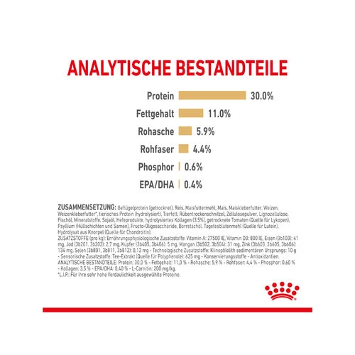 Dehydrierte Geflügelproteine, Reis, Maismehl, Mais, Maiskleber, Weizen, Weizenkleber*, Hydrolysat von tierischen Proteinen, tierische Fette, Rübenschnitzel, Zellulosepulver, pflanzliche Fasern, Fischöl, Mineralien, Sojaöl, Hefeprodukte? hydrolysiertes Kollagen (3,5%), getrocknetes Tomatenmark (Lycopinquelle), Flohsamen- und Flohsamenschale, Fructo-Oligosaccharide, Borretschöl, (afrikanischer) Tagetes-Extrakt (Luteinquelle), Knorpelhydrolysat (Chondroitinquelle) *L.I.P.: Proteine, die aufgrund ihrer sehr hohen Verdaulichkeit ausgewählt wurden